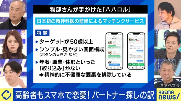 ABEMAのニュース番組「ABEMA Prime」にて、弊社代表 物部医師が出演し、高齢者の孤独・孤立を解消するマッチングサービスとしてハハロルを紹介いたしました。番組内では、70代の利用者様の体験エピソードを交えながら、サービス立ち上げの背景や特徴についてお話ししています。