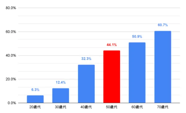 50代男性の44.1%、60代では半数以上がAGAを発症しています。